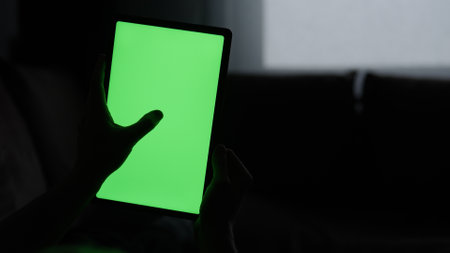 Chroma key on electronic devices, phone and monitor, green screen and hand scrolling through the screen in the absence of light
