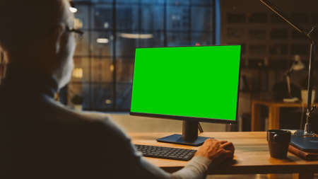 Over the Shoulder: Confident Middle Aged Man Sitting at His Desk Using Desktop Computer with Mock-up Green Screen. Evening in the Stylish Office Studio with City Window View