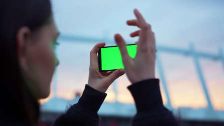 mobile phone with green chroma key on touch screen in woman hands.