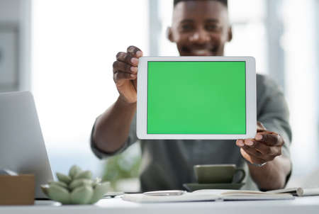 A tablet with a green screen on a wooden table in a modern office setting.