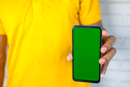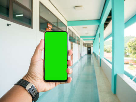 hand of man holding mobile smart phone with chroma key green screen on gren background