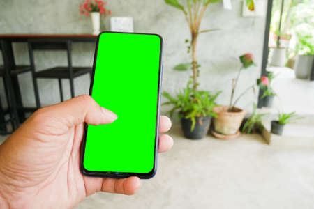 Hand is holding the smartphone with green chroma key screen on home green plants background.