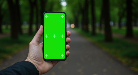 Hand holds smartphone with green screen & tracking markers in blurred park. Ideal for app demos, VFX, & mobile ads. Tech meets nature with blank template.