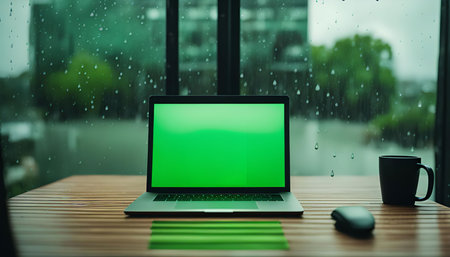 A close-up of a laptop computer on a wooden desk with a cup of coffee. The window behind the laptop has raindrops on it and a blurry view of trees and buildings.