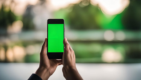 A person holds up a smartphone, its bright green screen ready for any custom content.