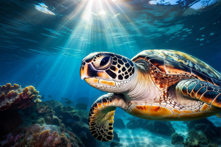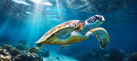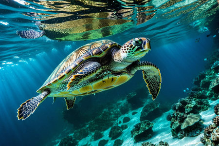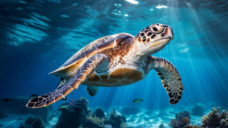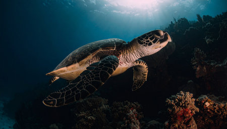 Majestic sea turtle swimming over coral reef in sunlit ocean