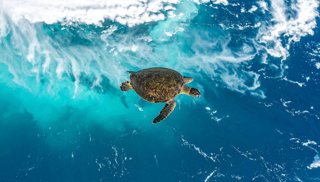 A lone sea turtle glides gracefully through the crystal-clear turquoise ocean, just beneath the turbulent white foam of a breaking wave. This serene moment captures the quiet majesty of marine life and the peaceful solitude of the vast, wild sea.