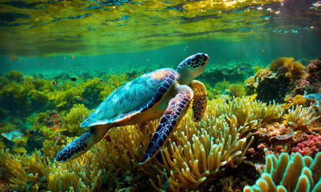 A stunning sea turtle gracefully swims through a vibrant coral reef, showcasing the beauty of marine life and the importance of underwater ecosystems.
