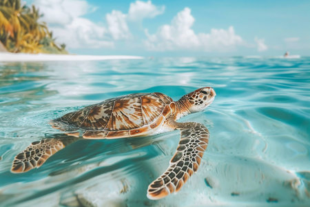 An AI generated illustration of a sea turtle swimming in shallow waters near a tropical beach shoreline