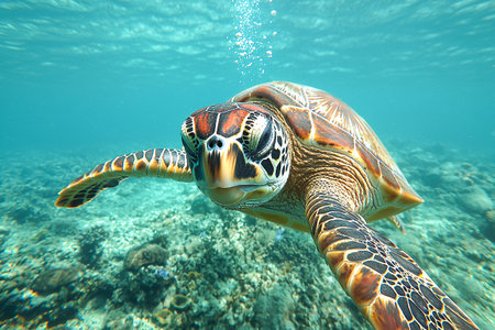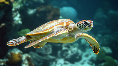 A beautiful sea turtle gracefully swims through crystal clear blue water, showcasing vibrant colors of its shell against an enchanting coral reef backdrop.