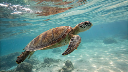 A beautiful sea turtle glides peacefully through its natural underwater habitat. Sunlight illuminates the sandy seabed, highlighting this majestic marine creature's shell patterns.