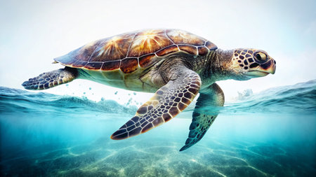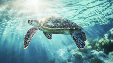 High-resolution image of a majestic sea turtle gliding through clear blue water, with sunlight filtering through and creating a serene, underwater scene.