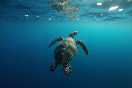 A top-down view of a sea turtle gliding through clear blue waters, with sunlight filtering through, capturing the serene beauty of marine life.