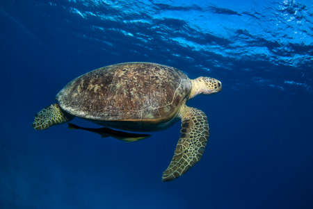 Hawaiian Green Sea Turtle cruising in the warm waters of the Pacific Ocean in Hawaii