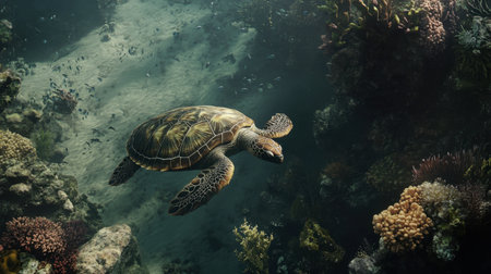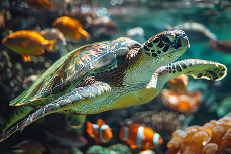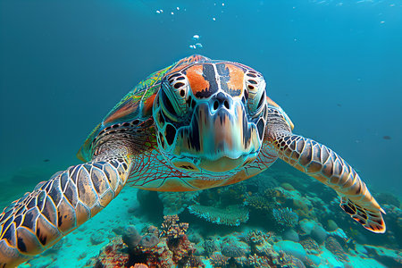 A beautiful close-up portrait of a sea turtle swimming gracefully in a vibrant coral reef habitat. The image captures the tranquil essence of marine life.