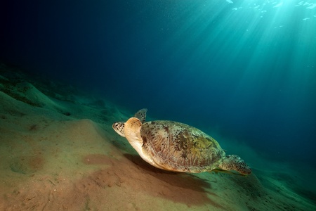 Green Sea Turtle (Chelonia mydas) swimming underwater.