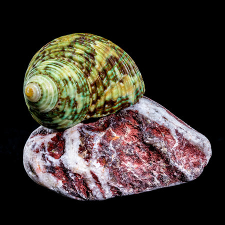 Polished green jade banded turbo sea shell displayed on colorful polished stones against a black background