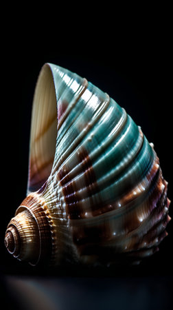 A striking close-up of a Turbo imperialis shell featuring green stripes and ridged texture. Its spiral design and polished surface stand out beautifully against the black background