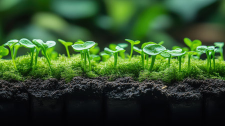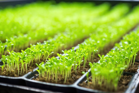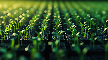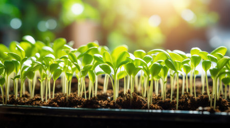 a row of seedling trays filled with fresh green sprouts, created with generative ai