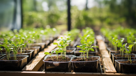 seedlings sprouting in small pots on greenhouse table, created with generative ai