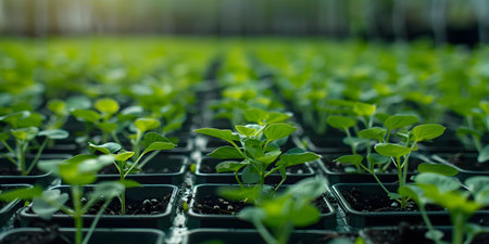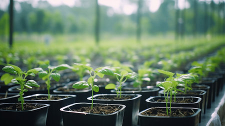 Close-up of fresh green seedlings emerging from black pots, arranged in rows within a nursery. This vibrant scene captures the essence of plant growth and nurturing in agriculture.