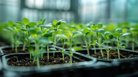 New green shoots flourish in a hightech controlled environment space. Concept Indoor Gardening, High-Tech Growing, Greenhouse Innovation, Sustainable Agriculture, Urban Farming