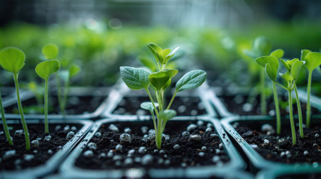 This image showcases a lush verdant scene of tiny sprouts thriving in a futuristic hydroponic garden The vibrant green leaves and healthy growth symbolize the potential for sustainable advanced