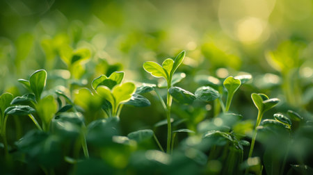 Group of young sprouts illuminated by morning sunbeams in a vibrant, sparkling garden, symbolizing growth, renewal, and new beginnings.