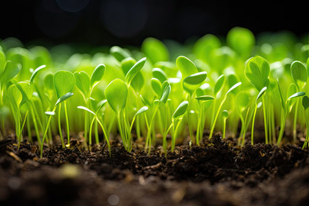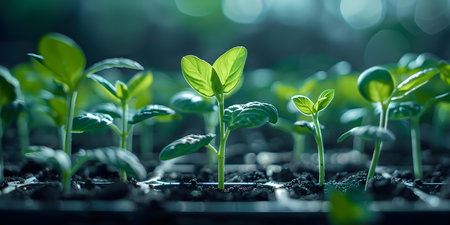 Seedlings, growth, soil, sunlight, green, plants. New life, nature, hope. Use for environmental blogs, gardening sites, growth concepts, inspirational content.
