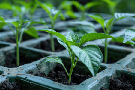 Young seedlings of pepper in a plastic box on a shelf in a greenhouse