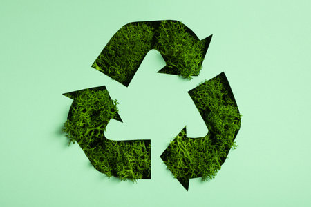 Green moss under paper cut recycling symbol. Save planet, eco, recycling concept.