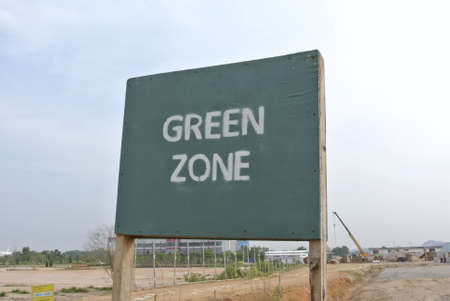 A Green Zone signboard placed at construction site in Selangor, Malaysia. The signboard allowed construction workers entering this area without wearing proper safety equipment.