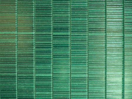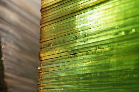 Surface, geometric pattern of the ends of thick glass. Green glass background, lines and strips
