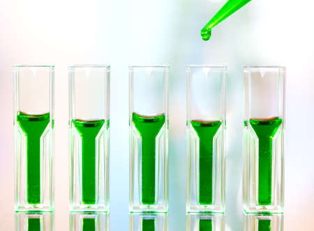 Color water glassware, reagents in the laboratory equipment, light and shadows