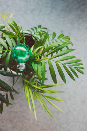 green economy and ideas for the environment conceptual image, green light bulb idea on top of lush parlour palm indoor in tiny pot shot at shallow depth of field