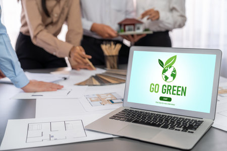 Top view green company meeting on environmental awareness and ecological protection regulation implementing to reduce CO2 emission and save Earth as responsible and eco-friendly company. Trailblazing
