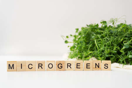 Vegetable pea sprouts, microgreens on white background, vegan health superfood. Inscription from wood letters microgreen