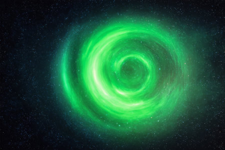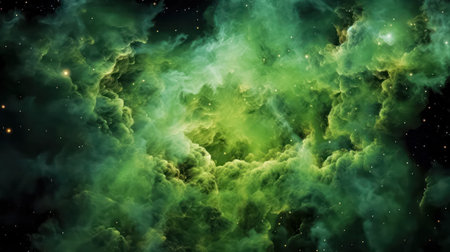 A stunning view of outer space showcases a swirling green nebula against a backdrop of deep black, speckled with distant stars, creating a mesmerizing cosmic scene.