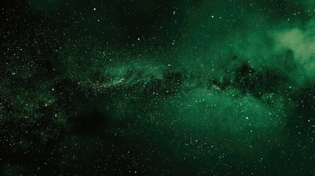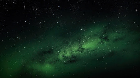 3D illustration of a glowing green space background with stars and a nebula, set against a dark black sky. --ar 78:43 --v 6.1 Job ID: a3a9a383-aeb2-4506-9ac1-f39d728c196b