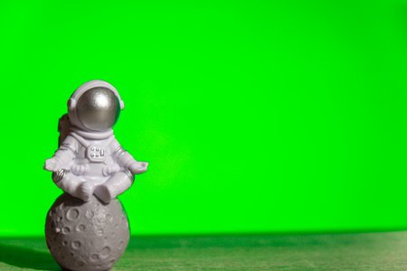 Plastic toy astronaut on green chroma key background Template Mock up Copy space. Concept of out of earth travel, private spaceman commercial flights missions and Sustainability