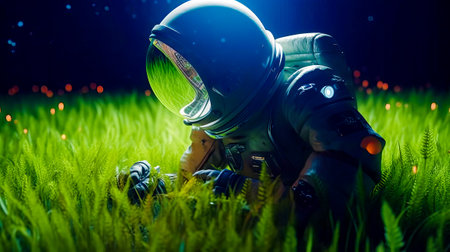 spaceman looking at mysterious plants with green light , digital art style, illustration painting, fantasy concept of a cosmonaut
