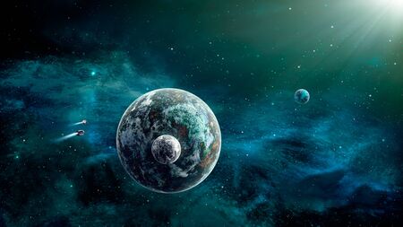 Space background. Two spaceship fly in colorful nebula and planet. 3D rendering