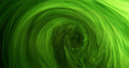 Glitter mist. Ink swirl. Magic spell. Defocused neon green black color vapor cloud shiny particles texture paint floating in water abstract art background.