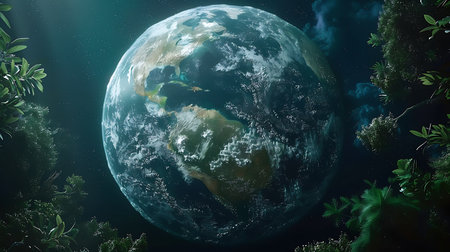 An artistic rendering features a smartphone displaying a globe covered in dense green foliage. The composition uses a vibrant green background, emphasizing the ecological theme. The image's lighting is soft, and the texture suggests a natural, organic environment. This concept could be utilized in various digital media or promotional materials.
