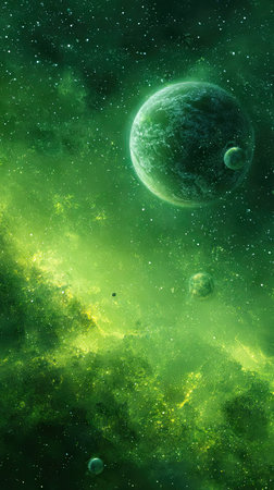 An artistic depiction presents celestial bodies in space, dominated by shades of green and yellow. Planets and a nebula are prominent, with stars scattered throughout. The composition features an ethereal, otherworldly style suggesting outer space. This image is suitable for various commercial uses, including artistic and science-related projects.