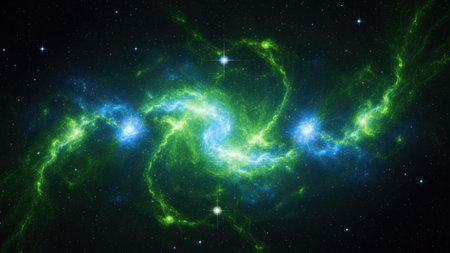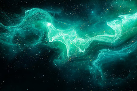 An artistic depiction showcases a vibrant cosmic nebula. The image presents swirling formations of green and blue luminous energy against a dark backdrop. The composition is characterized by a dynamic flow of light and color, hinting at deep space phenomena. Suitable for science, education, or visual art projects.