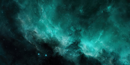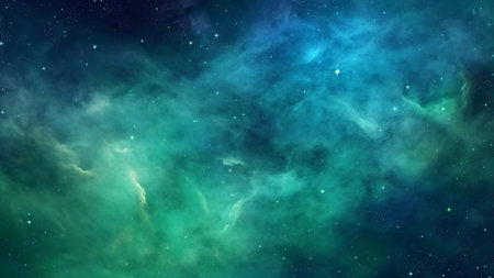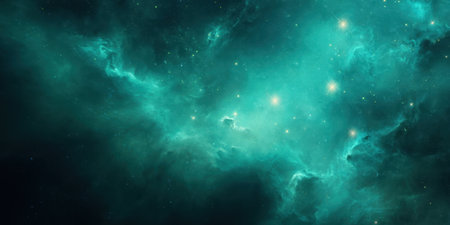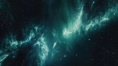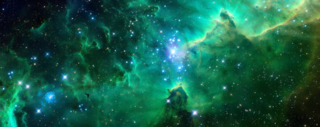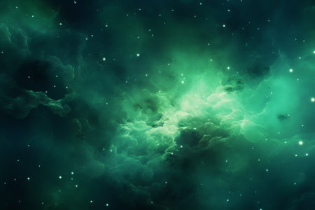 This stunning image captures the beauty of a cosmic landscape featuring vibrant green and blue clouds with shimmering stars. Perfect for illustrating the wonders of the universe and the mysteries of space exploration.
