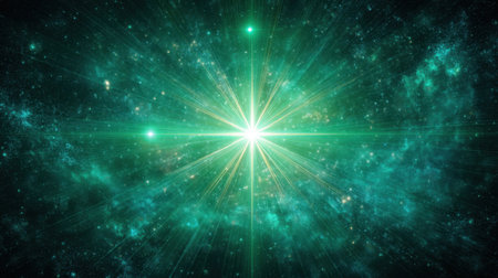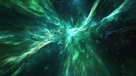 Experience the awe of a vibrant cosmic explosion with radiant green light radiating through a vast and mysterious space filled with stars.