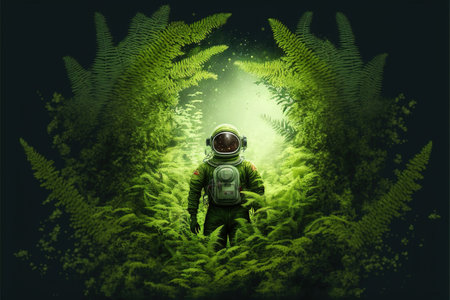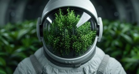 Astronaut exploring lush greenery through visor