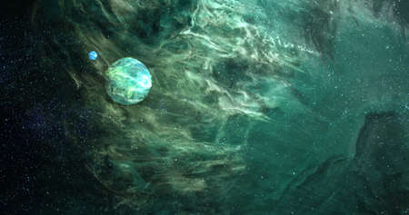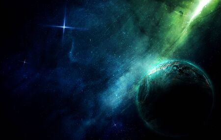 abstract space illustration, planet and blue-green nebula in the radiance of stars